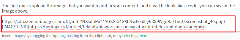 The first one is upload the image that you want to put in your content. and it will be look like a code, you can see in the image above.
