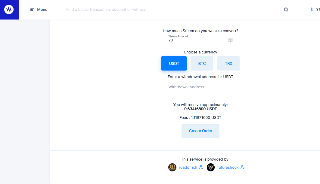 En esta oportunidad me voy a menú busco el sistema de la conversión y espero que me cargue la página nos indicara el monto que remos cambiar el monto mínimo es de 20 steem podemos cambiar en btc USD y trx nos cobrara un fees que es de 1.11966842 USDT.