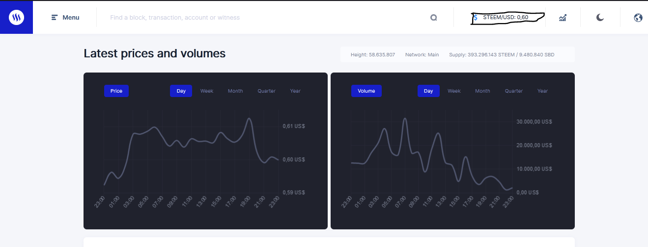 En esta caso hoy le vamos a dar una breve reseña de como entender steemscan es superfácil y sencillo no tienen ninguna complicación a la hora de iniciar tenemos que buscar la URL página oficial steemscan home luego al darle clic al primer enlacen que aparece en Google no abrirá la página y nos aparecen dos gráficos cada gráfico índico su característica el primero nos muestra el precio del steem que su valor es 0.60 USD a la 0.01 am hora de Venezuela el otro nos indica su volumen la cantidad de personas que han comprado o vendido el steem.