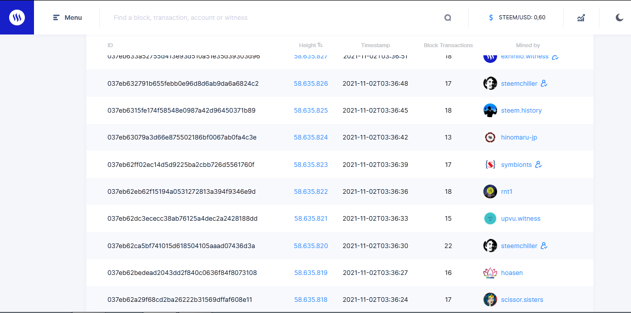En la cadena de bloque es algo parecido a la de transacciones en donde podemos identificar quien es el minador cuantas transacciones hace en el día él, id de bloque altura y por supuesto la hora y fecha.