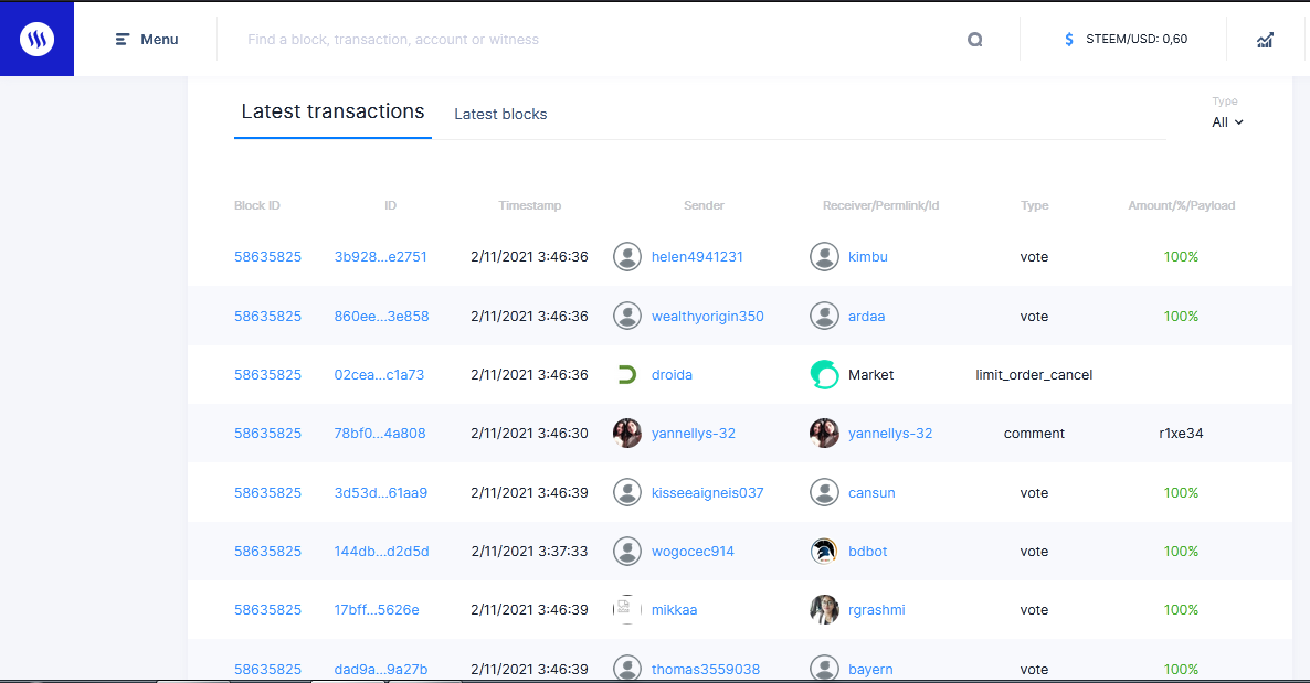 En la tabla de transacciones podemos observar a todo los usuarios de steemit y que tipo de movimiento hace en ese caso podemos ver los votos positivo negativo los me gusta seguir a otras personas etc.