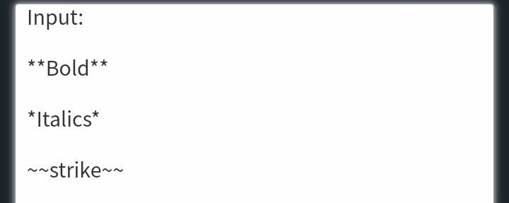 Bold, italics and strikes can be done using * and ~. The number of asterisk determines which pattern you want to use.