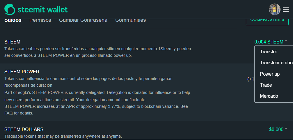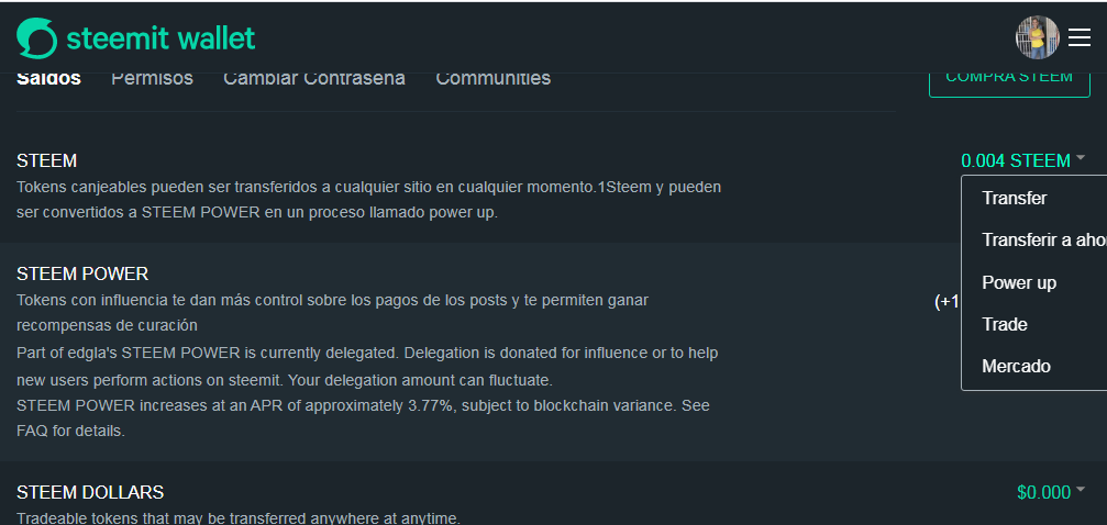 2. Luego hago click en la flecha pequeña que está al lado de la palabra steem en color verde, el cual desplegará una vez mas el panel con las cinco opciones (05), el cual se debe seleccionar esta vez, la tercera de las opciones para convertir a steem power.