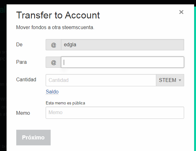 3. Nos aparecerá una ventana en el centro de la pantalla del computador o teléfono, de nombre transferencia a cuenta, el cual nos permitirá mover fondos a otras cuentas, en donde se indica el nombre de usuario del emisor, nombre de usuario del receptor, la cantidad a transferir y memo, al completar los datos anteriores se presiona el botón que dice próximo y así se completará el proceso de transferencia de Steem tokens a otro usuario de Steem.