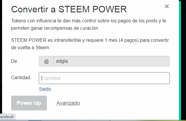 3. Nuevamente aparecerá una ventana en el centro de la pantalla del computador o teléfono, de nombre convertir a steem power, estos steem power, dan mas control sobre los pagos de los post y nos permiten ganar recompensas de curación. para realizar esta transacción solo hay que indicar el nombre de usuario y la cantidad a transferir, al completar los datos anteriores se presiona el botón que dice power up y así se completará el proceso de conversión a steem power.