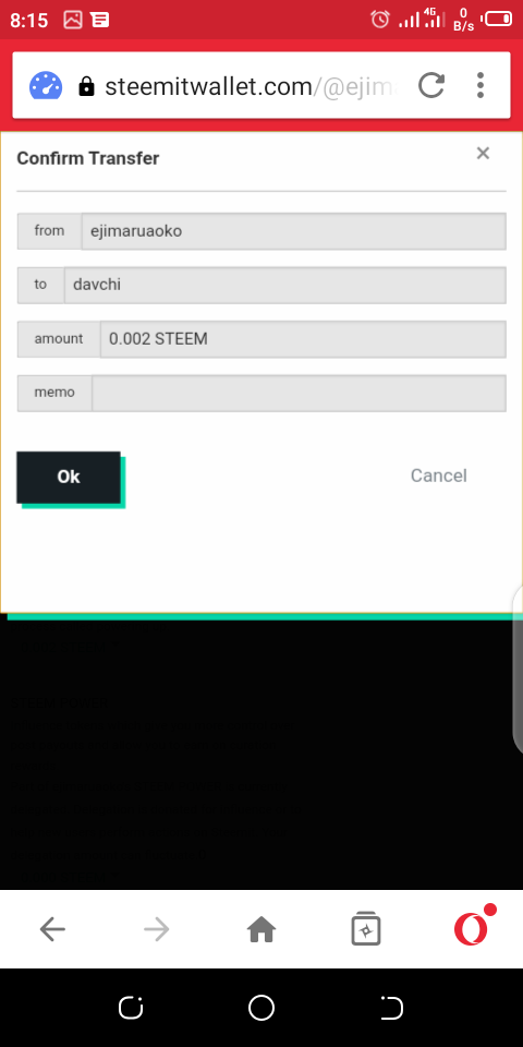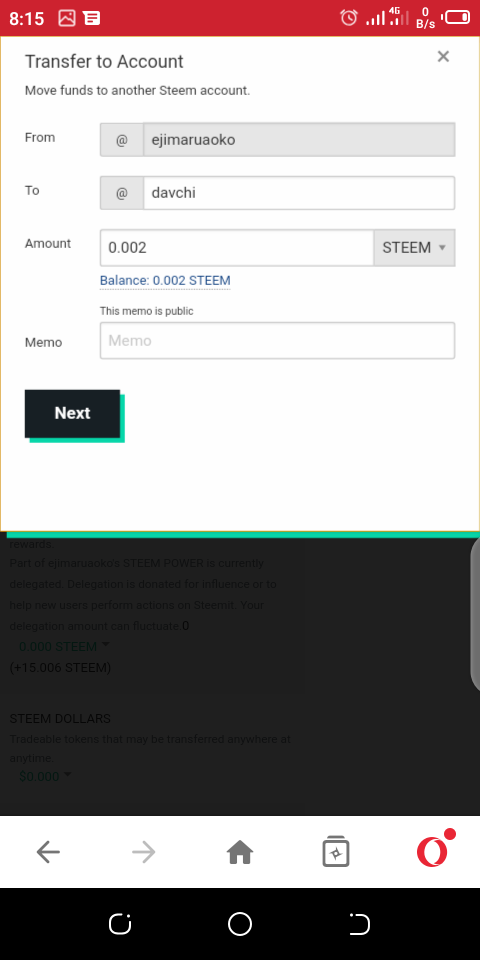 Click on STEEM Icon, then insert the amount of steem you wish to transfer, then you click on next. For instance I want to send to davchi, you can see that from the wallet below