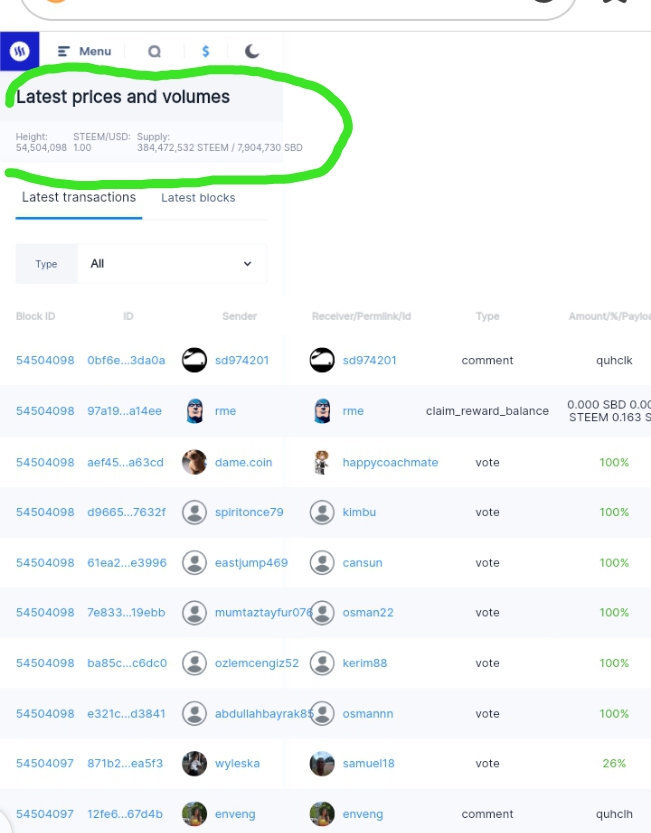 Steemscan has collection of lots of decentralized app and this dapp enables a user to locate and use any of the applications quickly as desired. To use this dapp, you get to the steemscan interface, click on menu to find Dapp and when u click on it, you get to see the different application and you click on your desired one.LATEST TRANSACTIONS; steemscan enables a user to see the latest transaction happening in the steem blockchain, transactions such as voting, commenting, replying and so on.