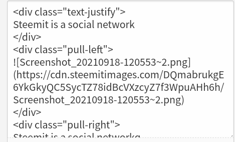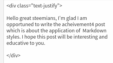 For your work to be enciting and appropriate, you need to justify your work, to do that, type < and then div give a space and type class= and "text-justify" and close with>. You have to do this before starting your post, at the end of the post you type < and / then you write div and close with>. This is how it will look like