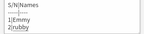 To tabulate your work, you first of all write the word you want at the Left hand of the table then you type| and write the second word, below it type --------|----- . Here is an example