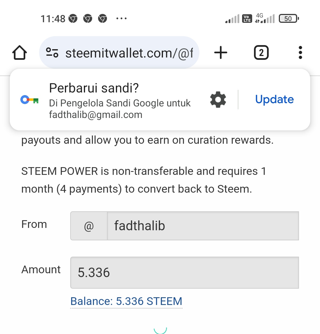 Setelah itu masukan pasword private active key lalu sign in. Kembali ke walet maka STEEM CAIR menjadi nol dan STEEM POWER naik sebesar nominal yang di power up. Untuk memastikan kita cek di steemworld.