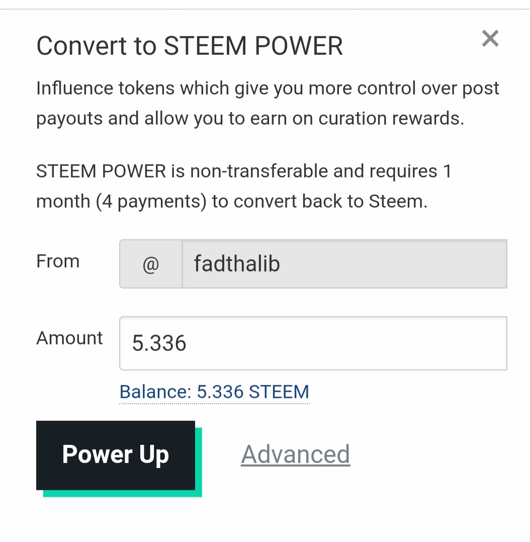 Masuk ke menu walet kemudian klik STEEM CAIR lalu pilih POWER UP lalu isi nominal STEEM yang akan di power up