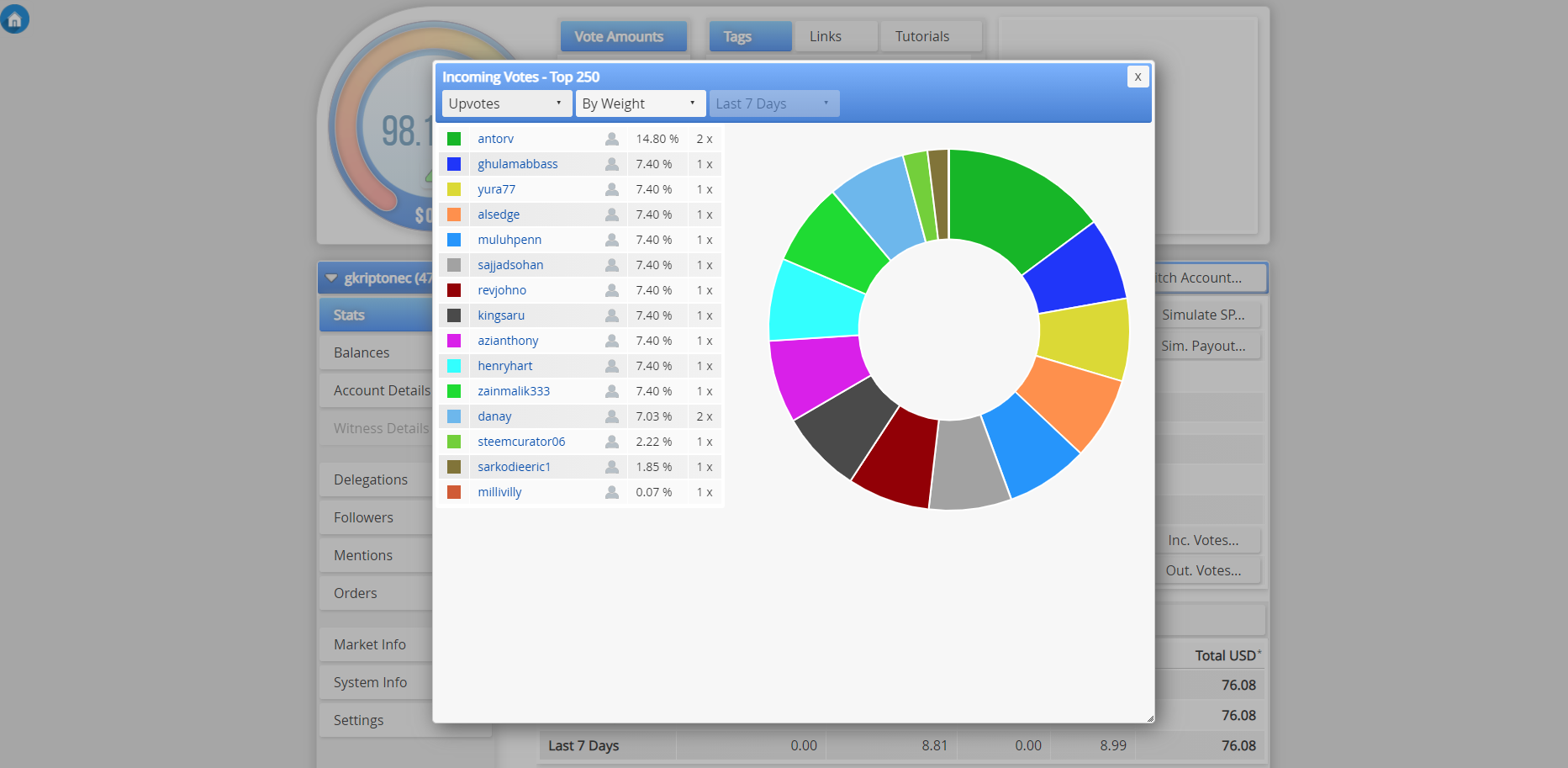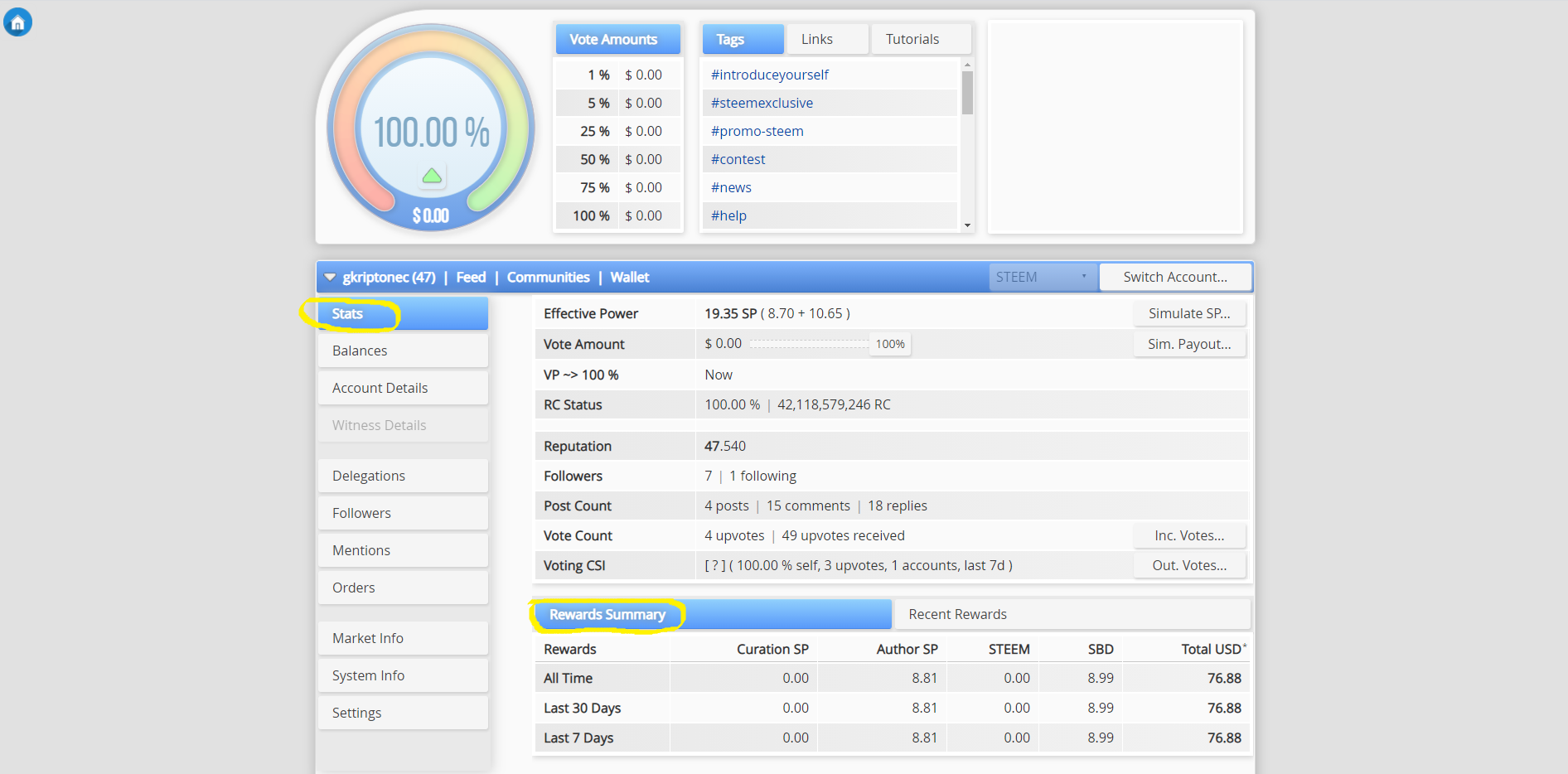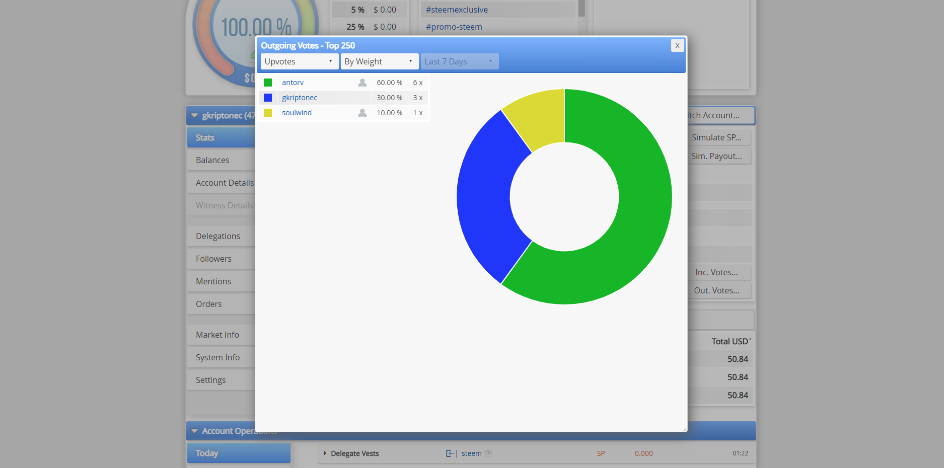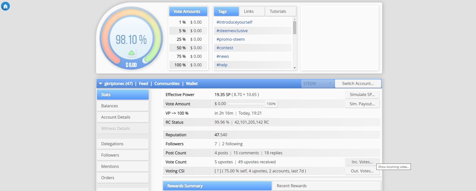 To check my upvote value I need to look at the top of the page. There is a round that shows the percentage of the votes (Vote Amounts). This showcases the corresponding $ values of the different voting percentages. These depend on how much Steem power I have in my account. I can set a different percentage of the vote power for upvoting posts. Also i can push “simulate sp amount” and “simulate payout amount” buttons to see how much SP i could have and how it would have affected my vote amount.