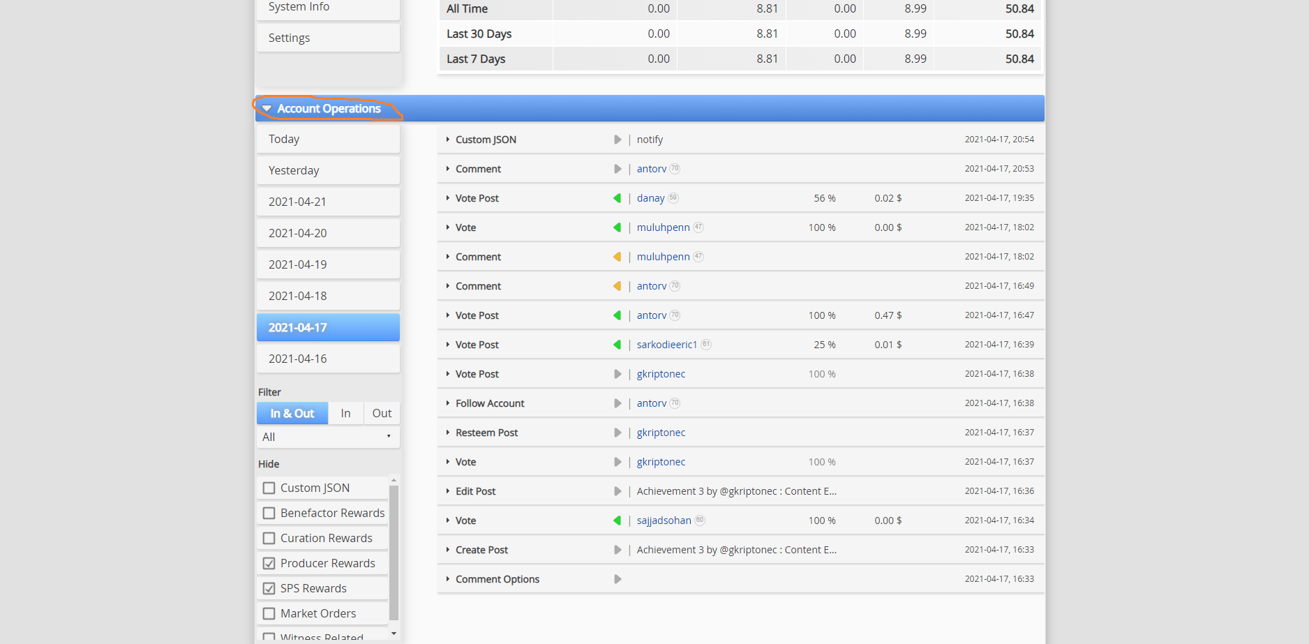 To check account operations for 7 days I need to choose a period of time - 7 days. I can check the following information: “Comments and Votes”, “Delegations”, “Downvotes (Flags)”, “Market orders”, “Rewards”, “Transfers” etc. Also, I can filter some information like choosing only “incoming” actions, only “outcoming” actions, or both, as well as hide some info (curation rewards, market orders, witness related, etc).