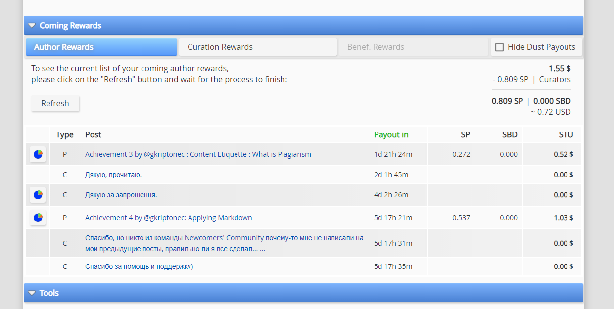Author rewards are the rewards that I receive for my posts. Curation rewards are the rewards that I receive for curating. Beneficiary rewards are the rewards that the user receives from the rewarded posts of other users, and the percentage of the reward is set by that user. All the rewards are valued in USD. I can receive a payout not earlier than after 7th day of posting. My author and curation rewards for the past 7 days are mentioned below in the screenshot.