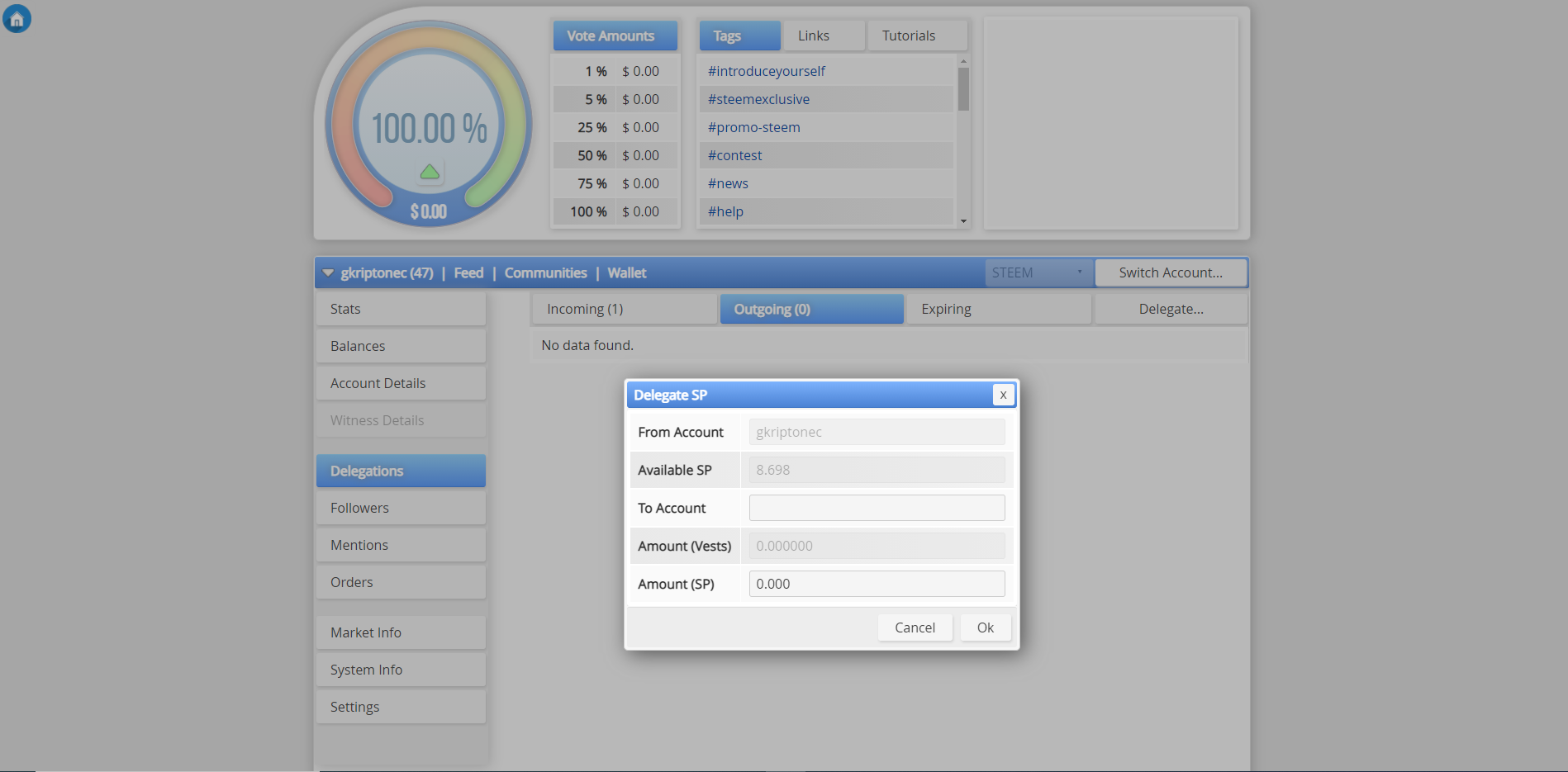 Tab “Delegations'' shows the outgoing and incoming delegations for my account. Term “Delegation” means that I can delegate (give, transfer) steem power (SP) to other Steem community members as well as they can do the same. When I delegate SP to someone it is called incoming delegation. When someone gelegate SP to me it is called outgoing delegation. To delegate SP I need to choose the tab “Delegations” and click on “Delegate SP”. Then I need to indicate the name of the account that I want to delegate SP and the amount of the SP. After that I need to click “OK” and a transfer will be done.