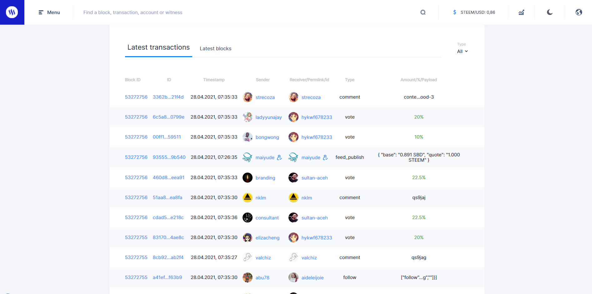 We can find the various latest transactions happening on the steem chain (voting, comments, etc.) in the “latest transactions” block.