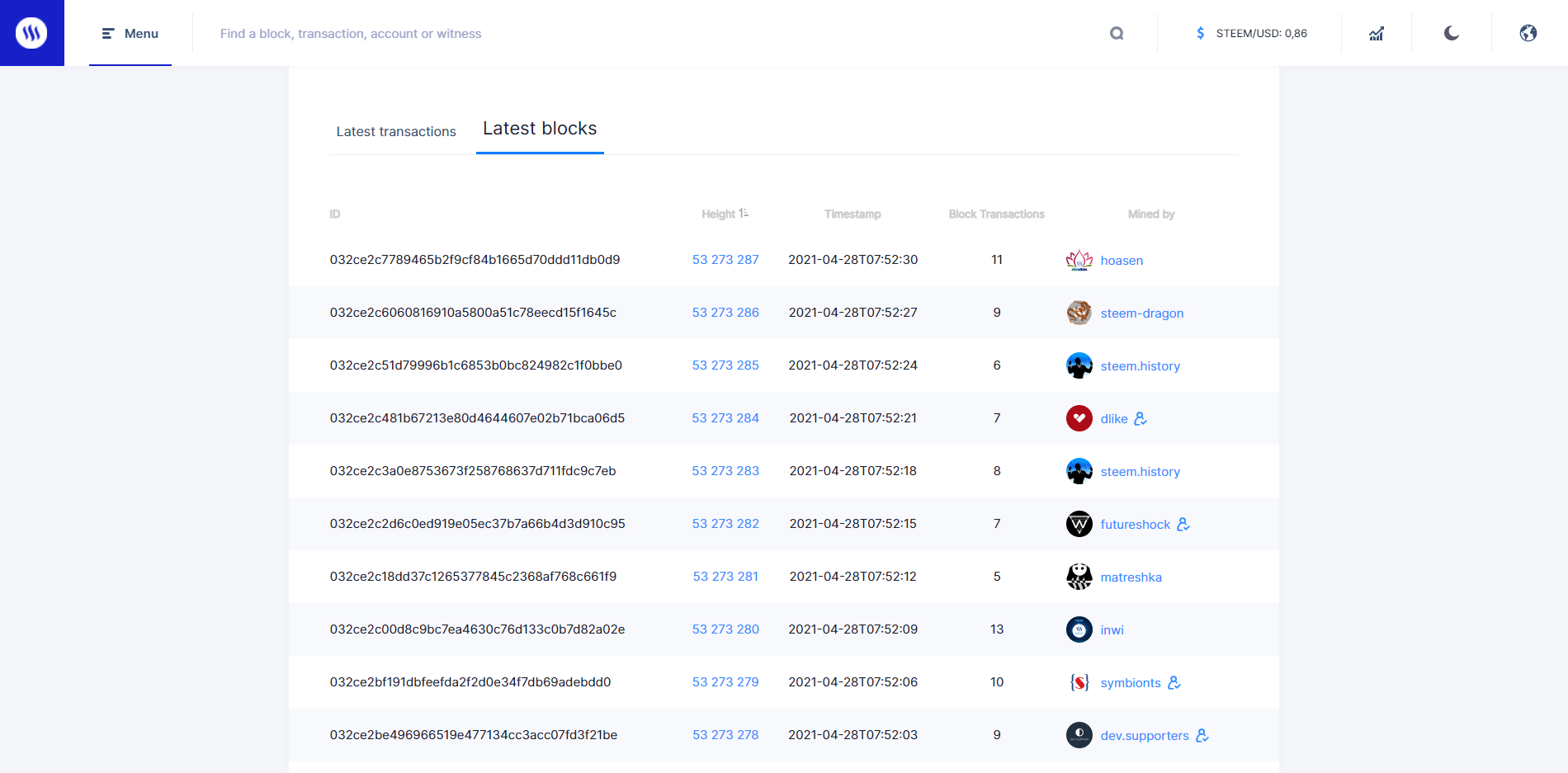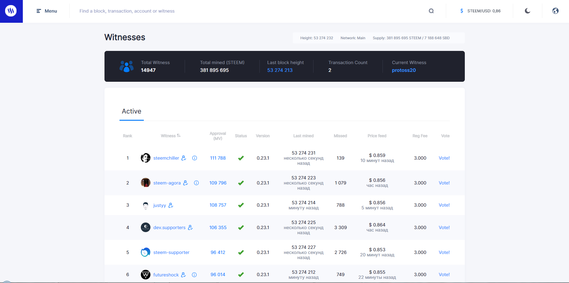 The information you can see under Witnesses section are: total number of witnesses (14947), rank of witnesses, list mined, price feed, total mined (STEEM) – 381 895 695, last block height (53 274 213), Transaction Count (2) etc.