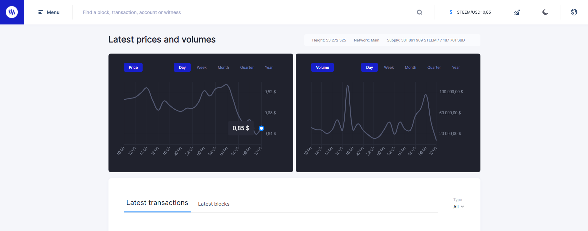 The current Steem price and volumes for today (28 April 2021) 10 p.m., according to the data of the Steemscan.com, are: