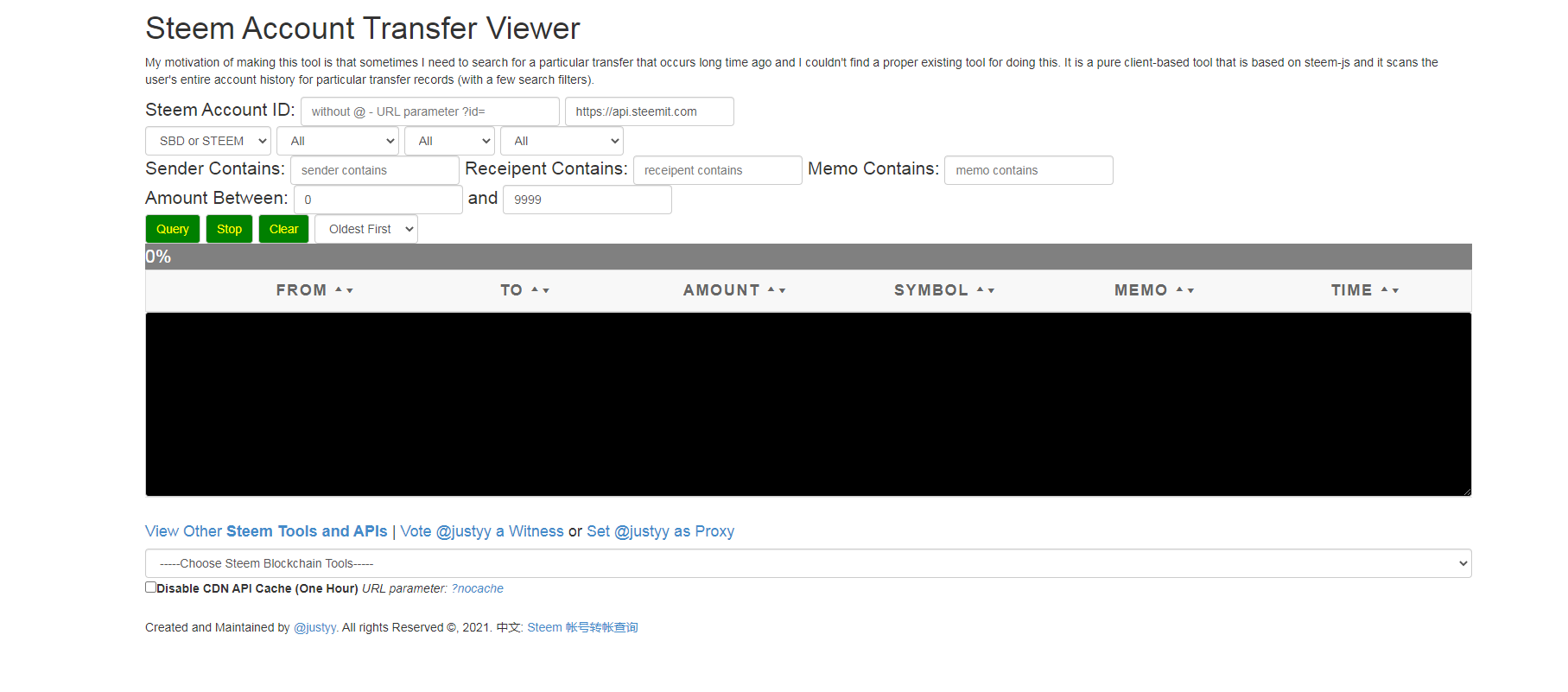 To check the Transfer History between any two Steem accounts I need to click on “Steem Wallet Tool - Steem Account Transfer Viewer”. Then I need to enter the data in “Steem Account ID” and push the “Query” button. It will load all information (including transfer money operations, sum etc.) about account that I pointed out in “Steem account ID” box with others users for all time.