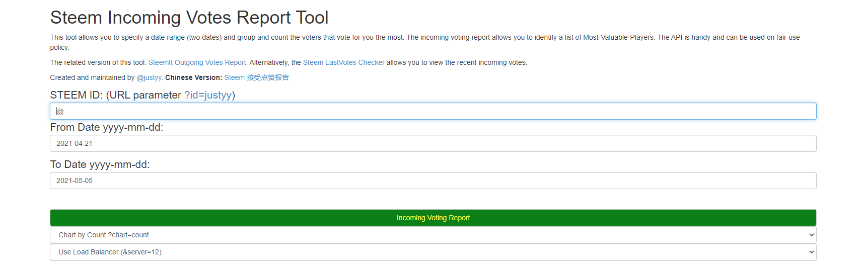 To check incoming votes you need to follow "Steem Incoming Votes Report" tool. In an open page you need to enter the data into boxes: “STEEM ID” “From Date yyyy-mm-dd” “To Date yyyy-mm-dd” and click the “Incoming Voting Report” button.