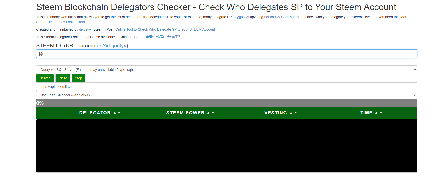 With "Steem Power Delegator Checker '' tool I can check who delegates SP to my steem account. All I need is to enter the id of the user into the “STEEM ID” box. Then i need to choose the type of search (“Query via sql server” or “Search the Blockchain”) and push “search” button.