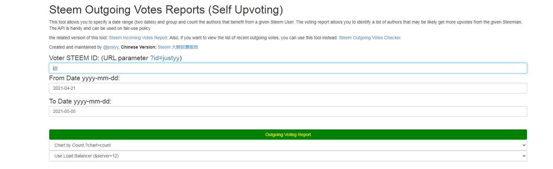 Steem Outgoing Votes Report tool allows to check the outgoing votes for a specific user. All you need is to fill the data in the next boxes: “Voter STEEM ID” “From Date yyyy-mm-dd” “To Date yyyy-mm-dd''. Then you need to click on the “Outgoing Voting Report” button.
