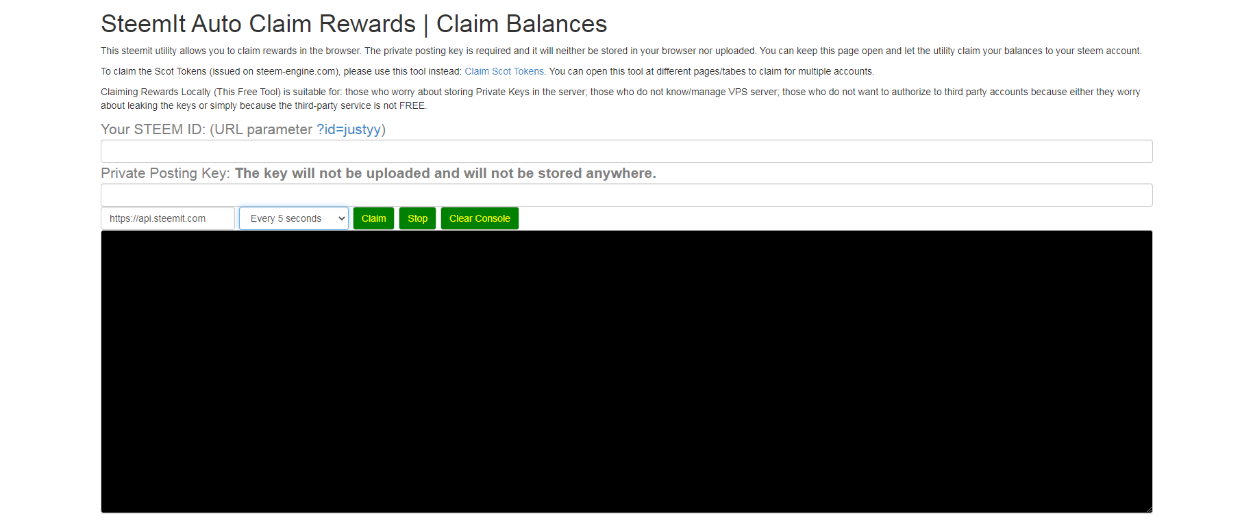 I can automate claiming STEEM or SBD with the “Steem Auto Claim Rewards” tool. I need to insert my steem id and a private posting key into the corresponding boxes, then set the time interval between 5 second and two hour and push “claim” button.