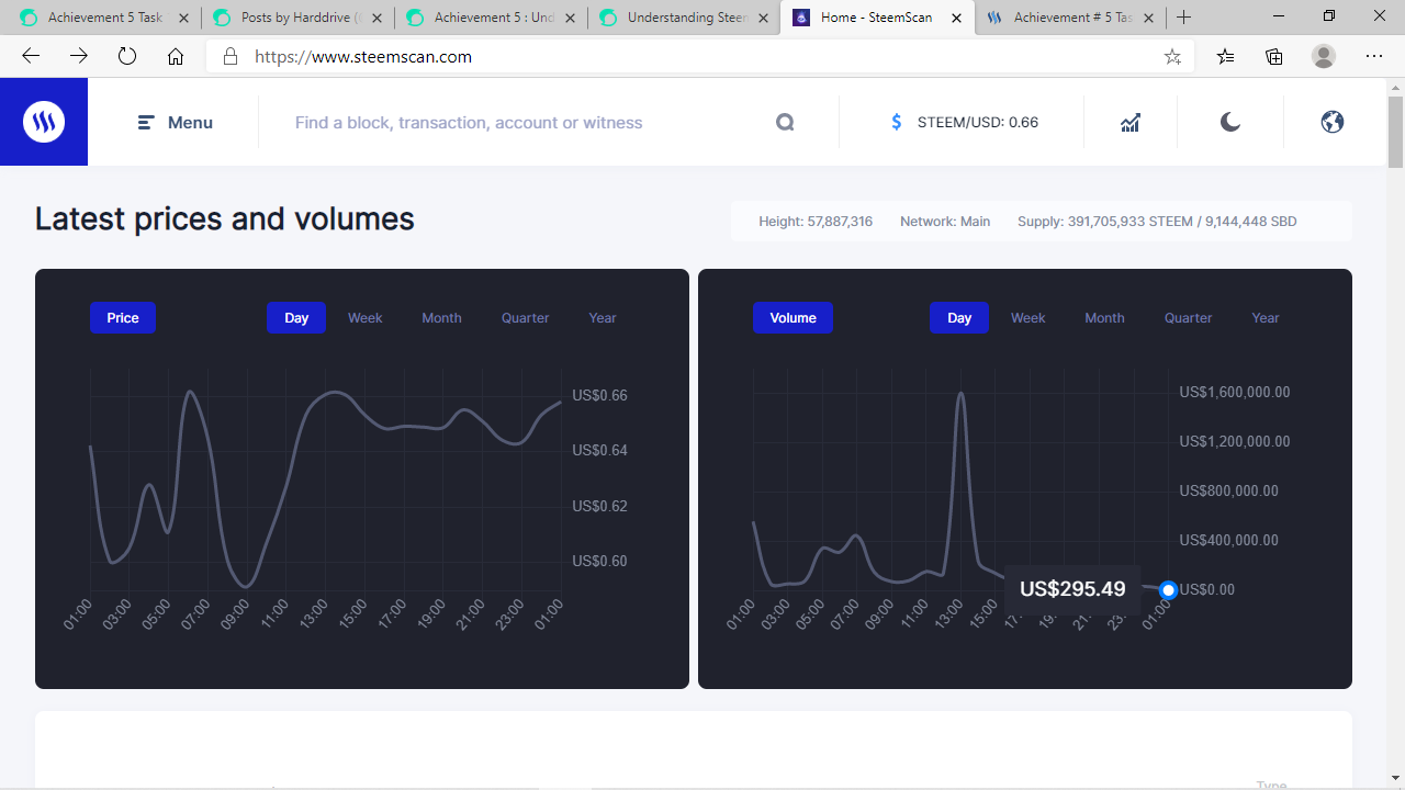 - On entering the website (steemscan), we can clearly see the current steem price and volumes presented in graphs.