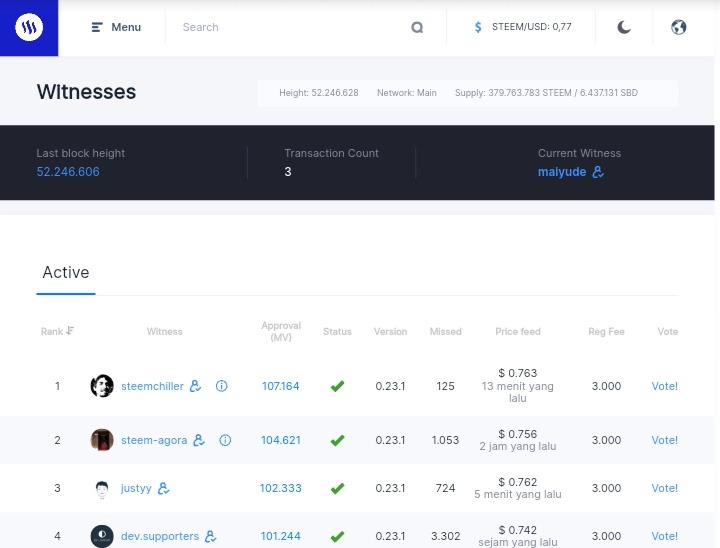 Dari gambar dibawah ada beberapa informasi yang tercantum dalam tabel mulai dari rangking para witness kemudian pada selanjutnya ada tab persetujuan, status dan versinya. Memilih saksi bisa dilanjutkan dengan menekan vote dengan melakukan login terlebih dahulu sesuai petunjuk.
