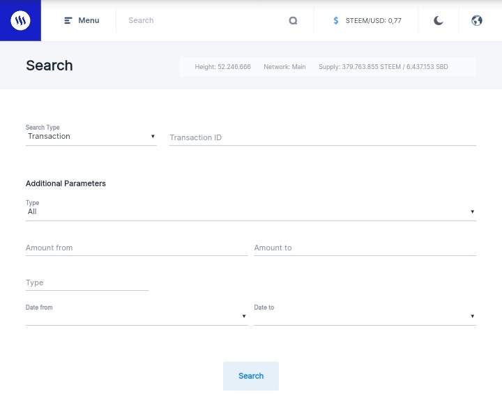Search - Pada fitur pencarian ini tersedia informasi akun dengan memasukkan data : username / ID Transaksi / ID blok.