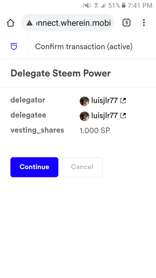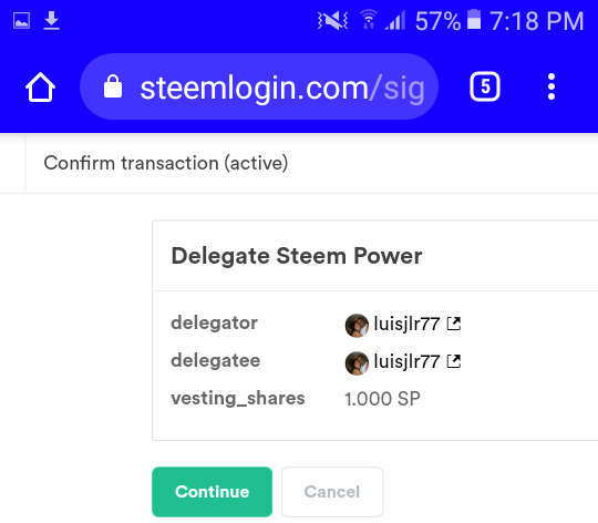 Como podemos observar en la captura de pantalla anterior, es sumamente sencillo la delegación usando esta herramienta, basta con rellenar los datos en el formulario y escoger a traves de cual opción nos conectamos a nuestro wallet, para que la transacción se procese, si utilizamos la opcion de steemlogin.com, nos enviará a que confirmemos, te invito a que veas la siguiente captura.👇