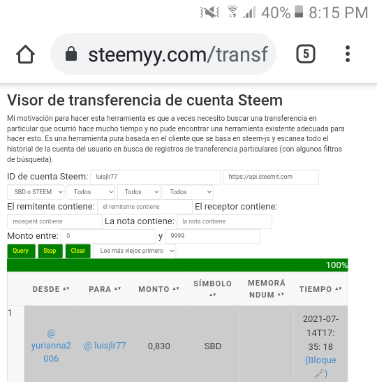 Para gráficar el ejemplo utilice mi usuario para mostrarles el proceso, es muy sencillo y rápido, solo con colocar esa información de usuario y presionar el boton de Query nos listará todas las transferencias realizadas y recibidas, también tiene la particularidad de que podemos consultar sólo las transferencias de SBD o las transferencias de Steem, con cifrado sin cifrado, con memo o sin memo, todo depende de lo que el usuario necesite