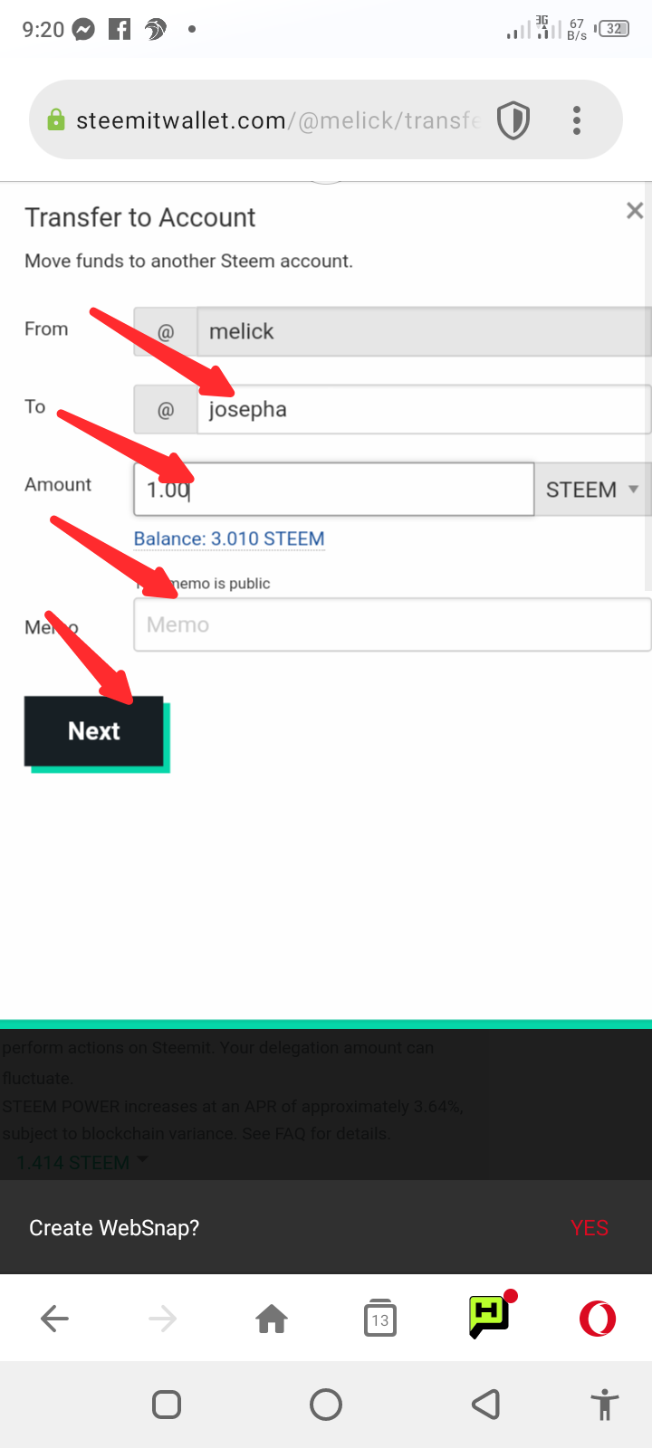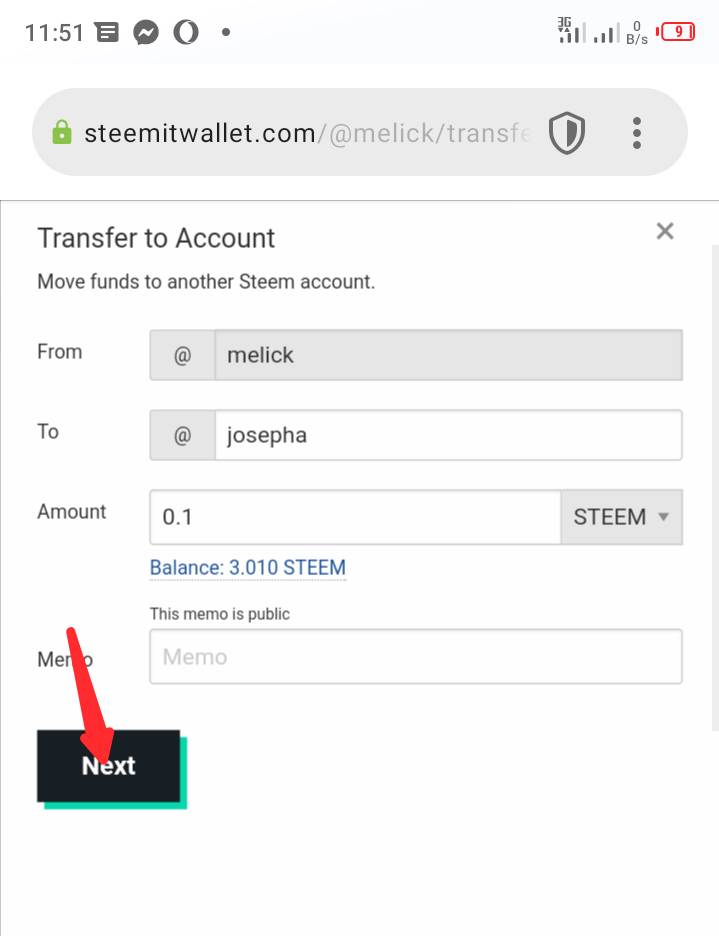 then I will now decide to write the name of the user account I'm transferring to, insert my memo key and the amount then I will click on next.