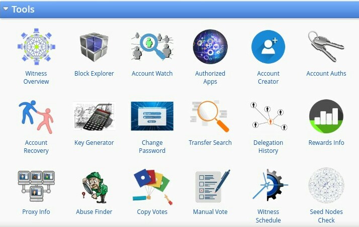 Tools disini berisikan tombol-tombol icon yang difungsikan untuk untuk menampilkan segala yang berhubungan dengan akun anda bahkan disini juga di sediakan tombol untuk melihat Block Explore, seed nodes check, proxy info Abuse finder hingga Key generator serta Change Password.