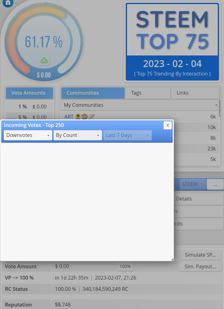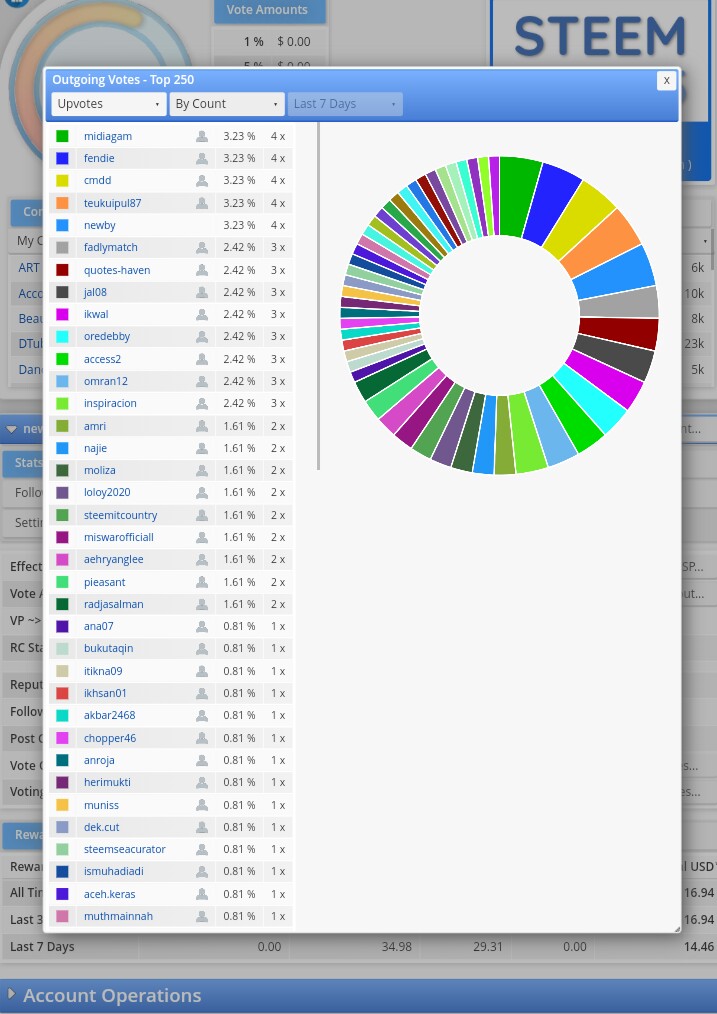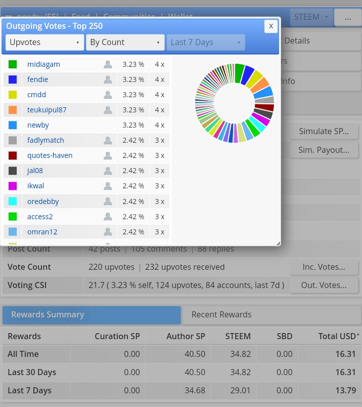 Masih pada tampilan menu yang sama, anda bisa melihat berapa banyak suara yang anda berikan kepada postingan akun steemit lain (Votting CSI) yakni dengan mengklick tombol Out. Vote