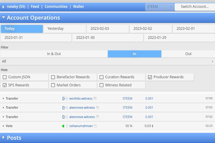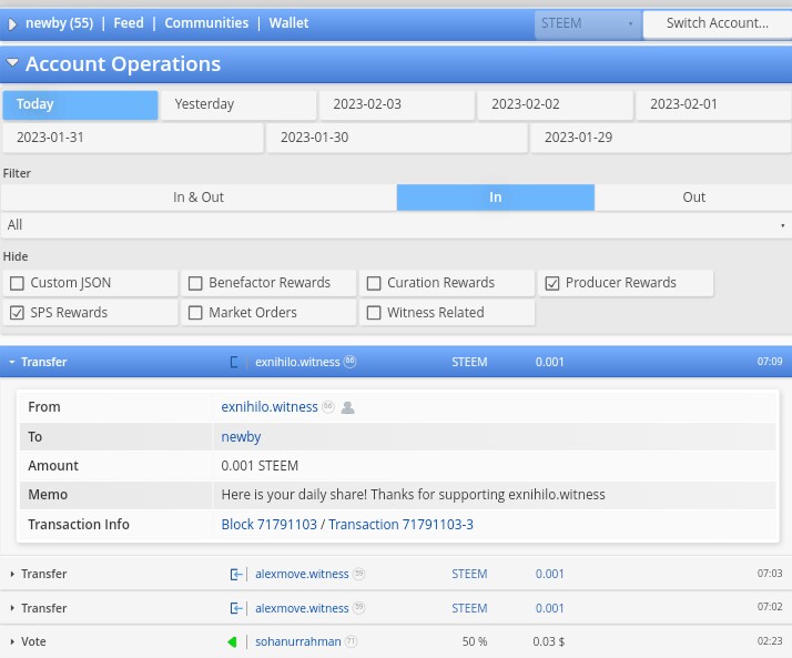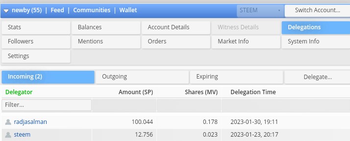 Disini anda bisa melihat delegasi yang masuk dan keluar, kapan itu dilakukan dan berapa banyak steem power yang di delegasikan.