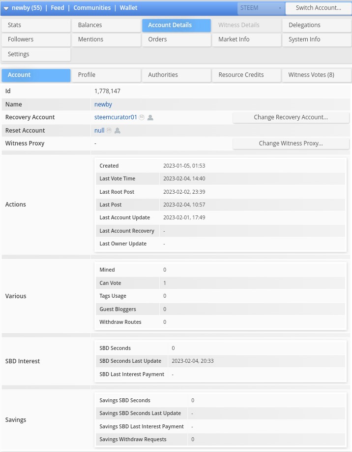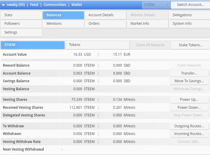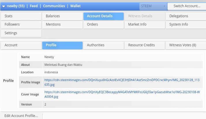 Disini anda bisa melihat berapa nilai akun anda juga kondisi kekuatan finansial anda dalam bentuk Steem, Steem Power, berapa banyak steem yang anda simpan dan lain sebagainya.
