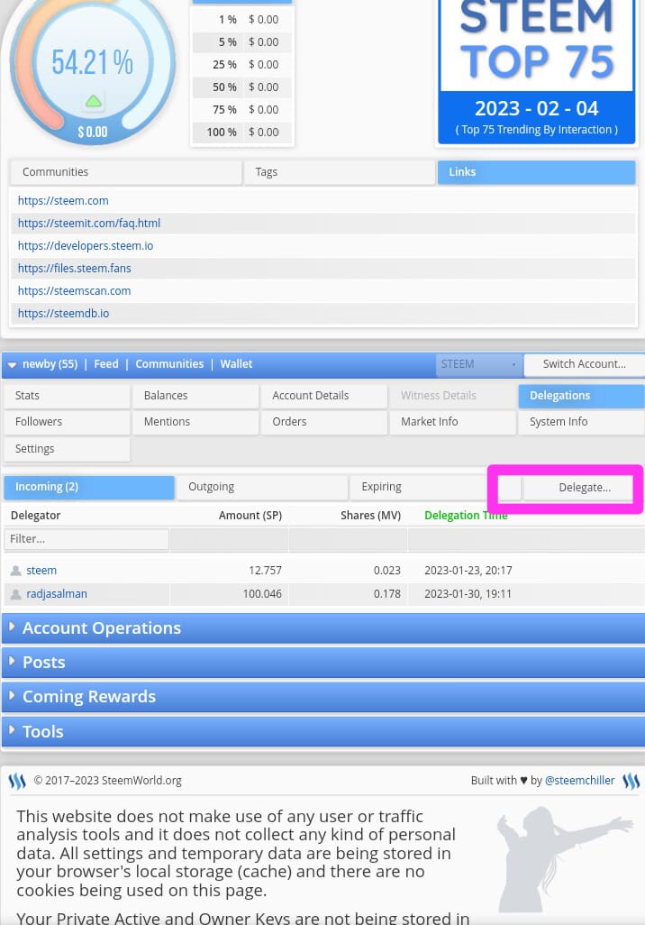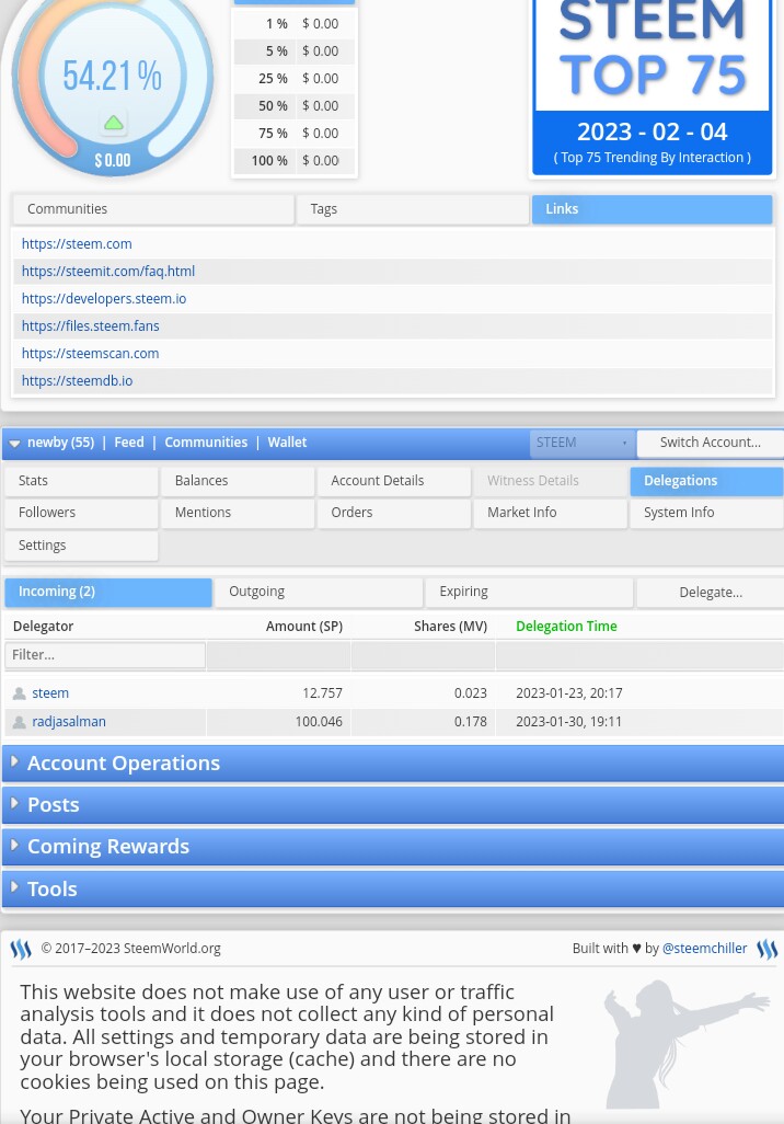 Ternyata setelah saya melihat steemworld.org saya baru tahu bahwa saya mendapatkan delegasi dari @radjasalman, pantas saja sekarang setiap saya posting atau berbalas komentar bisa dilakukan tanpa kendala. Terima Kasih ya @radjasalman atas titipan / delegasinya.
