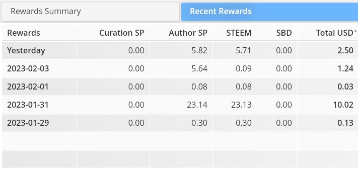 Dari akun yang saya miliki, dalam 7 hari terakhir saya mendapatkan 34,98 Author SP dan STEEM sebanyak 29,31 dengan Total USD* 14,15