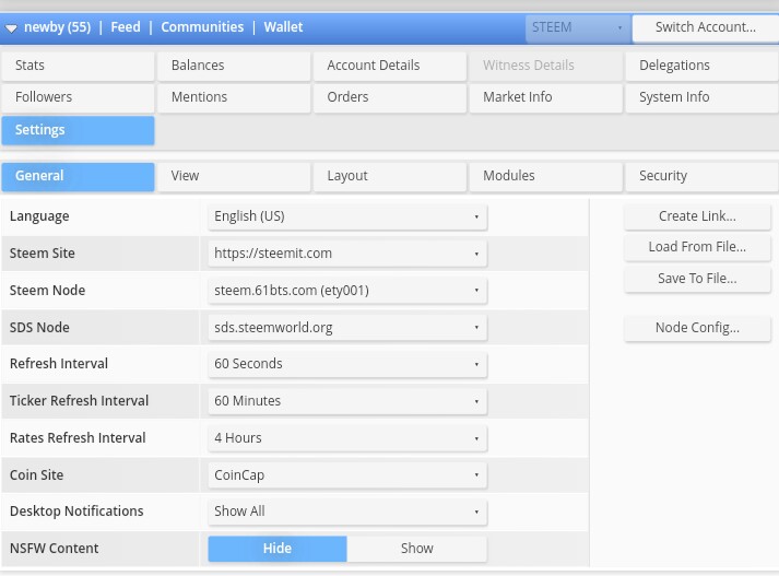 Disini anda bisa melihat penyetelan akun anda, setingan di steemit terbagi ke pada empat bagian, yaitu : General, View, Layout, Modules, Security