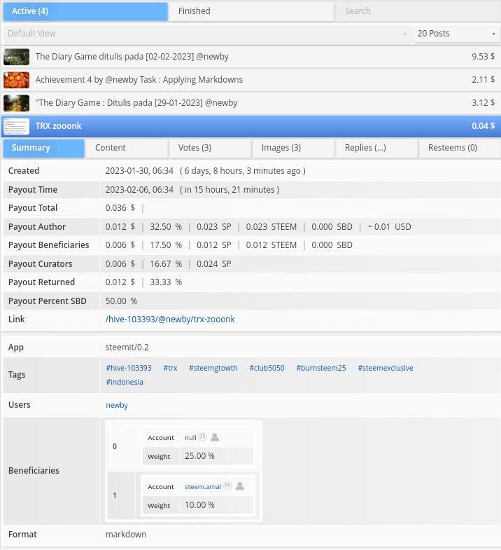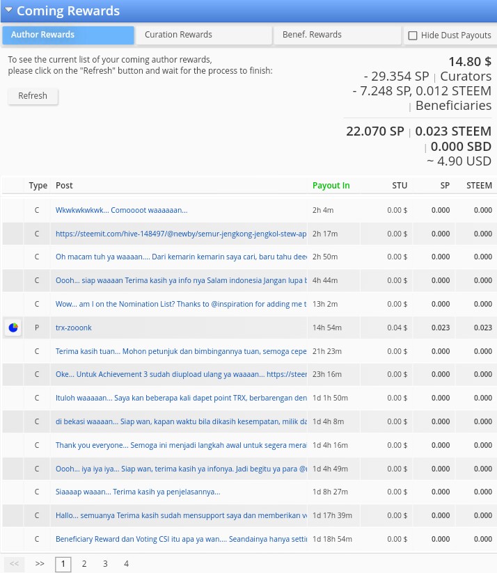 Dalam menu coming Reward ditampilkan postingan apa saja yang masih aktif dan berapa hasil yang didapat oleh postingan tersebut baik untuk Author, Curator maupun Beneficiaries bila memang postingan yang anda posting memberikan share benefit kepada akun pribadi maupun akun komunitas tertentu.