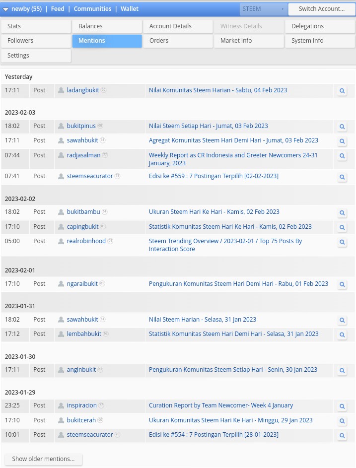 Disini anda bisa melihat, berapa banyak anda di sebut dalam steemit, siapa saja yang pernah dan dalam postingan apa anda di sebut.