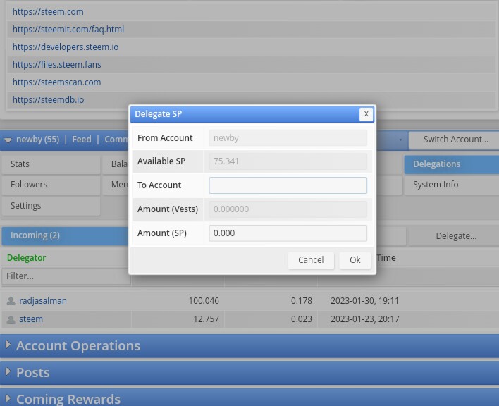 Lalu anda tinggal mengisi kepada siapa anda memberikan delegasi dan berapa banyak steem power yang ingin anda delegasikan, steem power yang akan anda delegasikan tidak boleh melebihi Available SP yang anda miliki, kemudian click tombol OK.