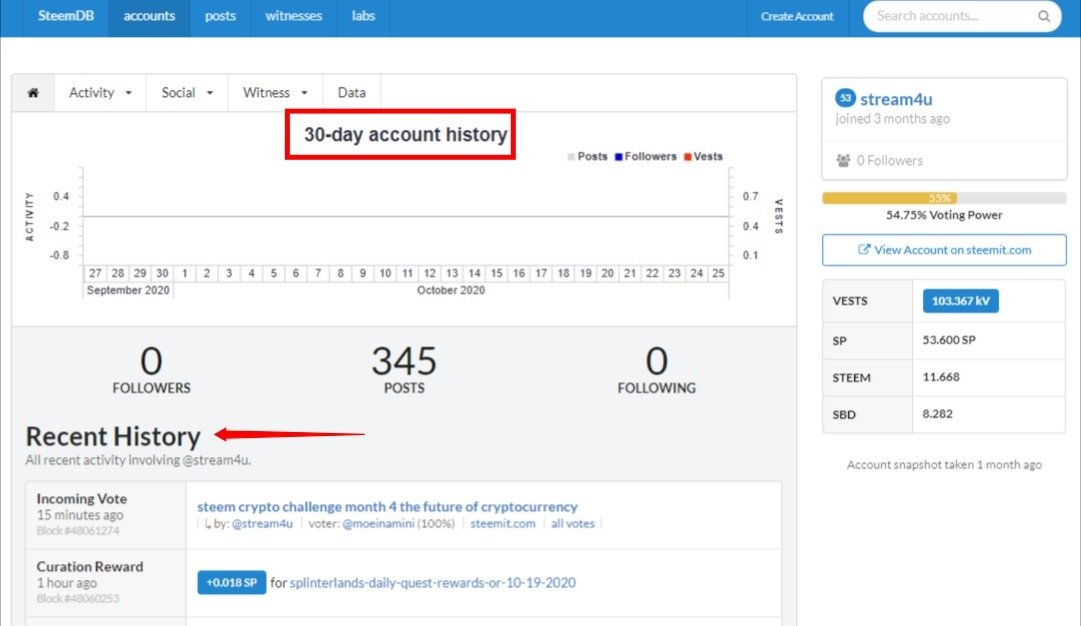 1: Login to https://steemdb.com/ and you have to click on accounts and fill in your steem username you want to search for the recent history.