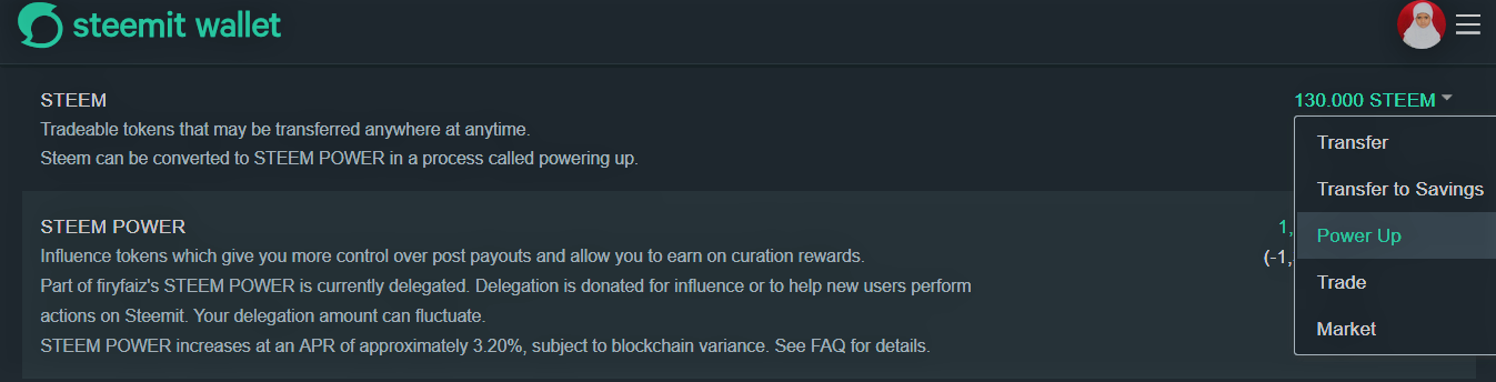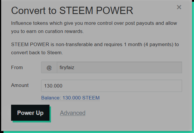 Cara melakukan power up: Klik "power up" pada bagian steem yang tersedia, setelah itu masukkan jumlah steem yang ingin dijadikan steem power. Terakhir masukkan sandi yang diminta, biasanya Active Key, Owner Key, atau Master Password.