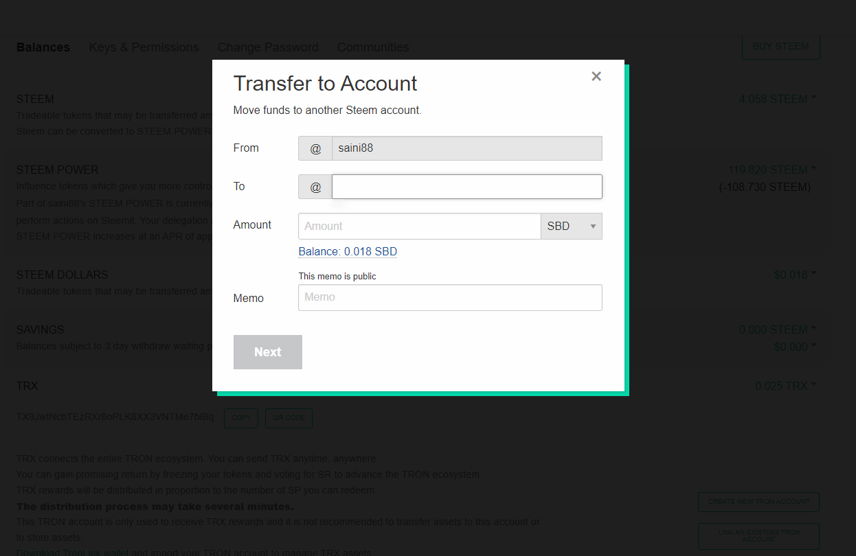 Login ke Akun Steemit Biasa, Klik foto Profile, kemudian pilih wallet, selanjutnya klik tanda panah pada tulisan STEEM, maka akan muncul kotak dialog seperti pada gambar dibawah ini. Pada kolom To isikan username pengguna steemit yang dituju, lalu isikan jumlah STEEM yang akan ditransfer, kemudian masukkan Memo Key (yang sudah kita bahas tadi) lalu klik next dan klik OK sebagai bentuk konfirmasi yang menyatakan bahwa kita akan mentransfer STEEM sejumlah …. Kepada ….