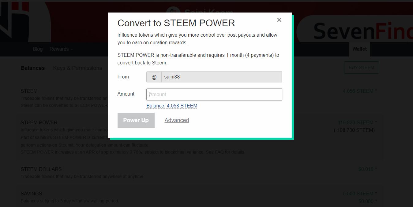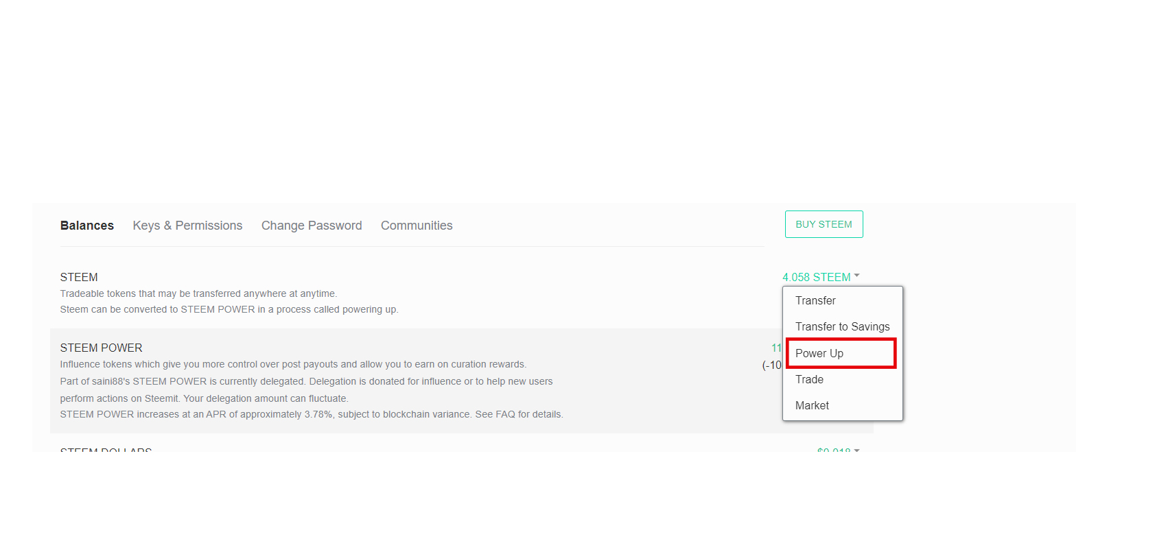 Dari steem yang kita dapatkan bias kita ubah atau kita transfer mendi STEEM POWER untuk meningkatkan daya atau yang sering disebut dengan melakukan POWER UP. Caranya klik tanda panah pada Tulisan STEEM pilih Power UP kemudian akan muncul kotak dialog yang harus diisi banyaknya STEEM yang akan diubah atau di konversikan menjadi STEEM POWER.