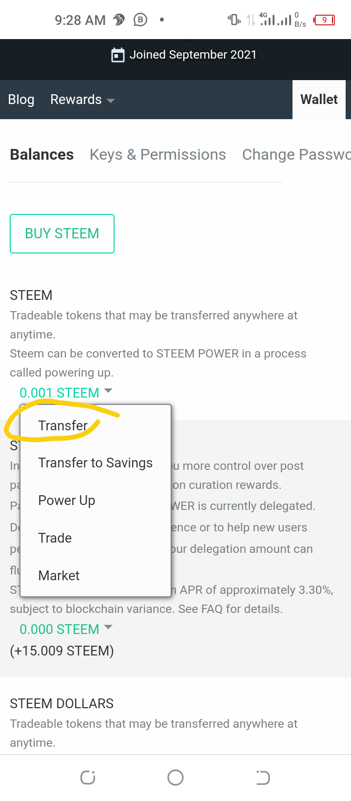 When transferring steem to another user account the first step is to click on the wallet option in the profile bar after which you click on the steem option, which leads to the option of transfer and other options follows as illustrated below;