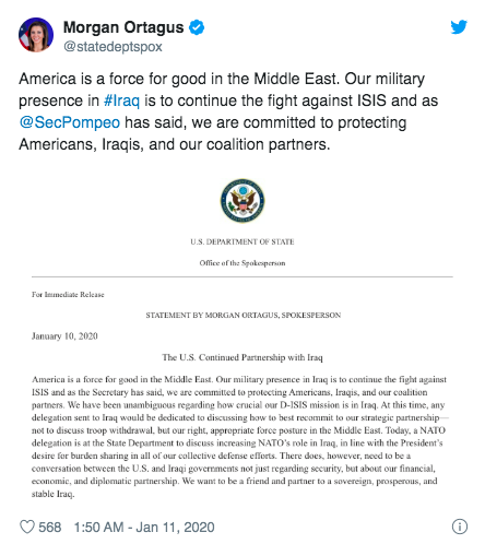 "America is a force for good in the Middle East. Our military presence in Iraq is to continue the fight against ISIS and as the Secretary has said, we are committed to protecting Americans, Iraqis, and our coalition partners. We have been unambiguous regarding how crucial our D-ISIS mission is in Iraq. At this time, any delegation sent to Iraq would be dedicated to discussing how to best recommit to our strategic partnership—not to discuss troop withdrawal, but our right, appropriate force posture in the Middle East. Today, a NATO delegation is at the State Department to discuss increasing NATO’s role in Iraq, in line with the President’s desire for burden sharing in all of our collective defense efforts. There does, however, need to be a conversation between the U.S. and Iraqi governments not just regarding security, but about our financial, economic, and diplomatic partnership. We want to be a friend and partner to a sovereign, prosperous, and stable Iraq."
