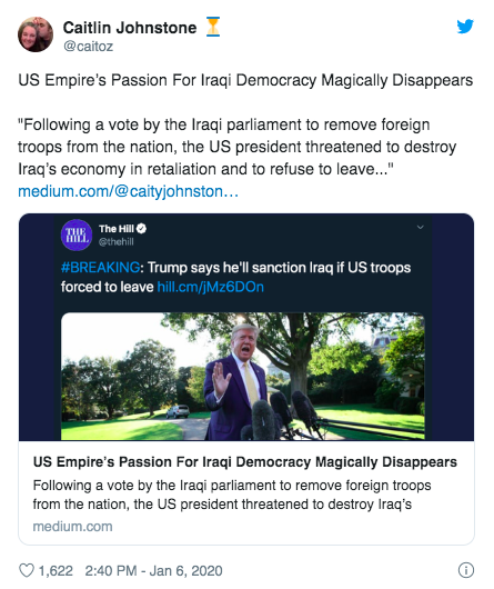 Since 2014, America's military presence in Iraq has been at the consent and invitation of the Iraqi government, the democratically elected government the US has used to justify its regime change intervention both before the invasion and ever since. Now that permission has been revoked, and the US government has suddenly lost all interest in Iraqi freedom and democracy. This US government, incidentally, is being led by a president who campaigned in 2016 on the platform of bringing the troops home from nations like Iraq.